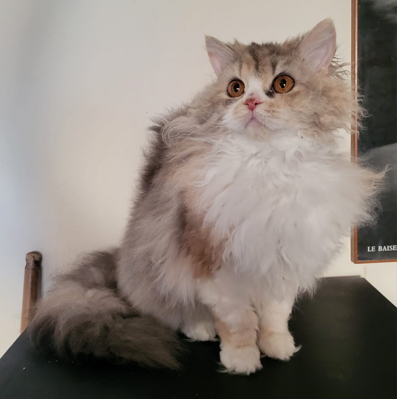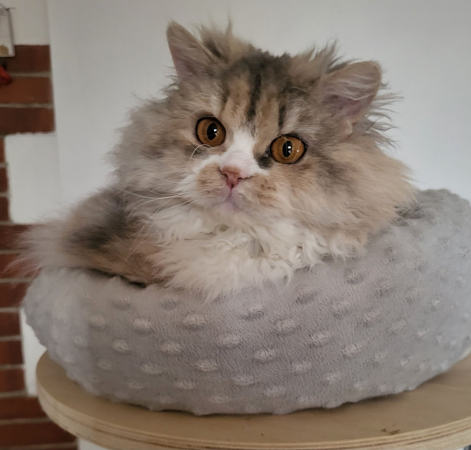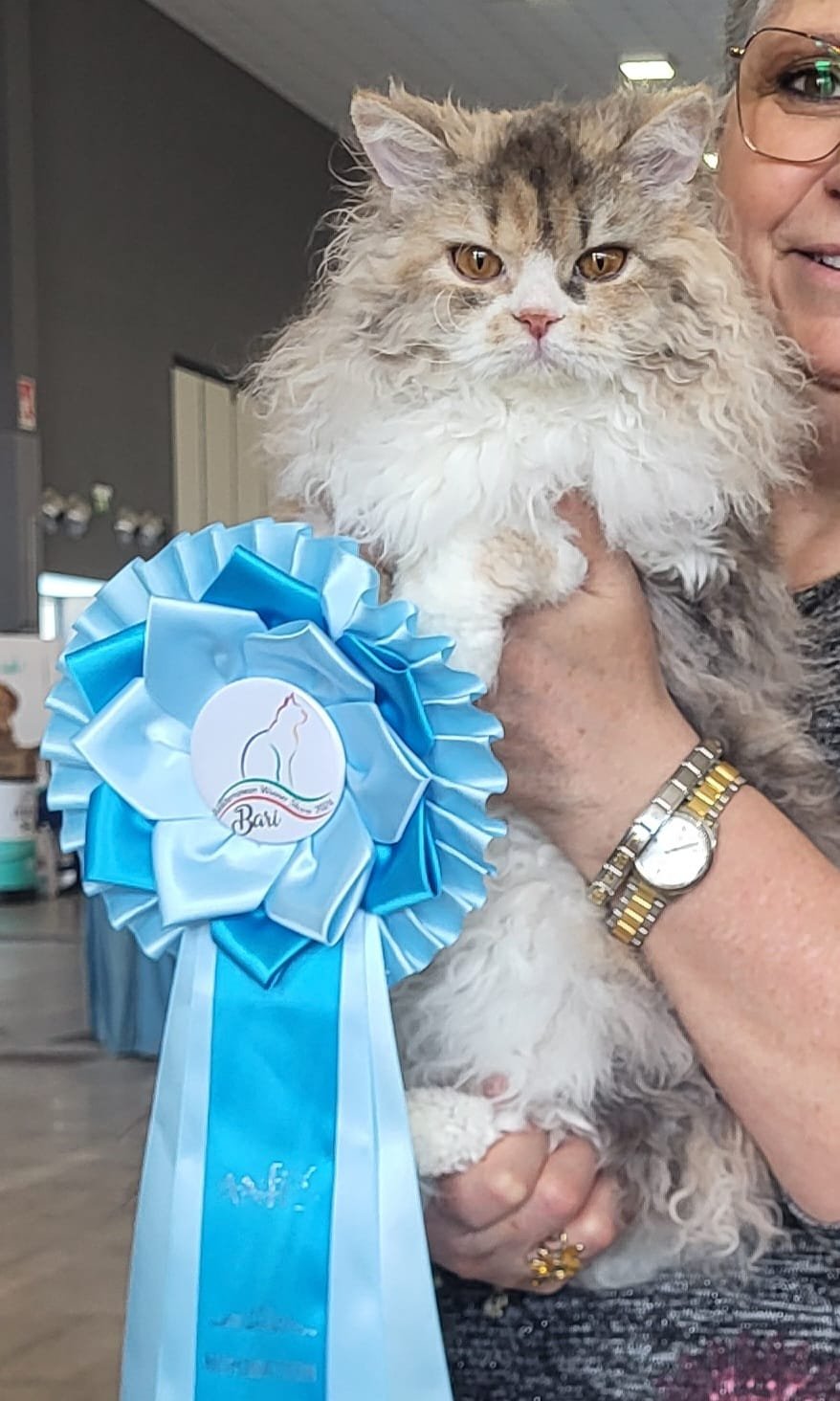 Selkirk Rex blue tortie tabby bicolor. E' una bella giovane femmina con due grandi occhi di color rame intenso e un carattere dolcissimo, tutta fusa e coccole. Ha anche un bel pelo lungo e frisé, una folta gorgera e un'espressione sempre un po' stupita. Anche lei è una splendida mamma per i suoi cuccioli che alleva con cura e amore. Viene dalla Slovenia ed è frutto della proficua collaborazione e grande amicizia con i suoi allevatori Saso e Nina.
