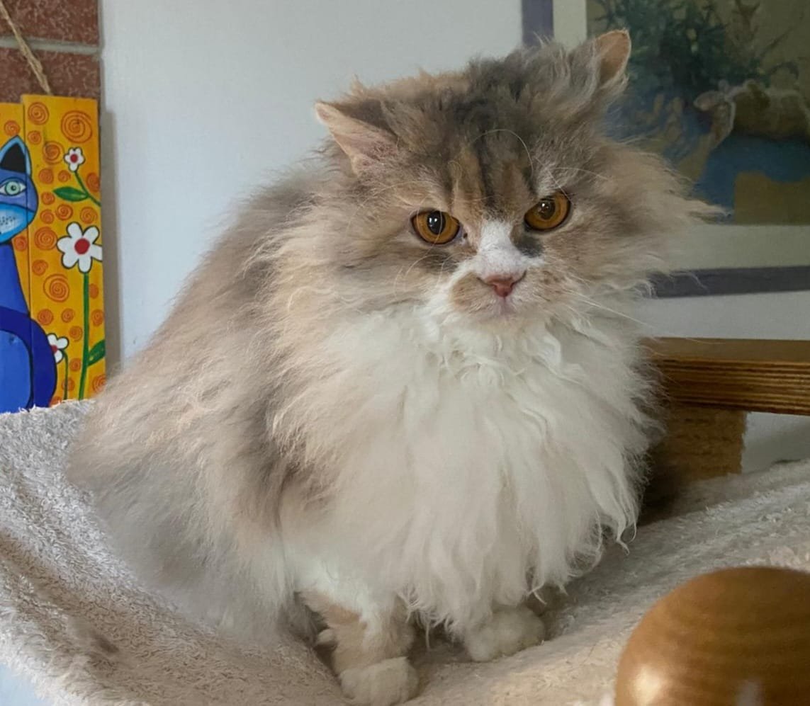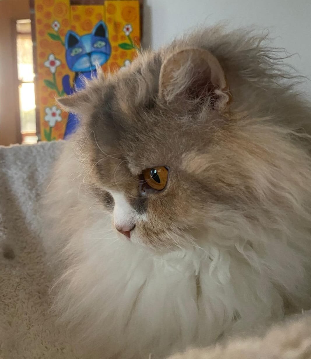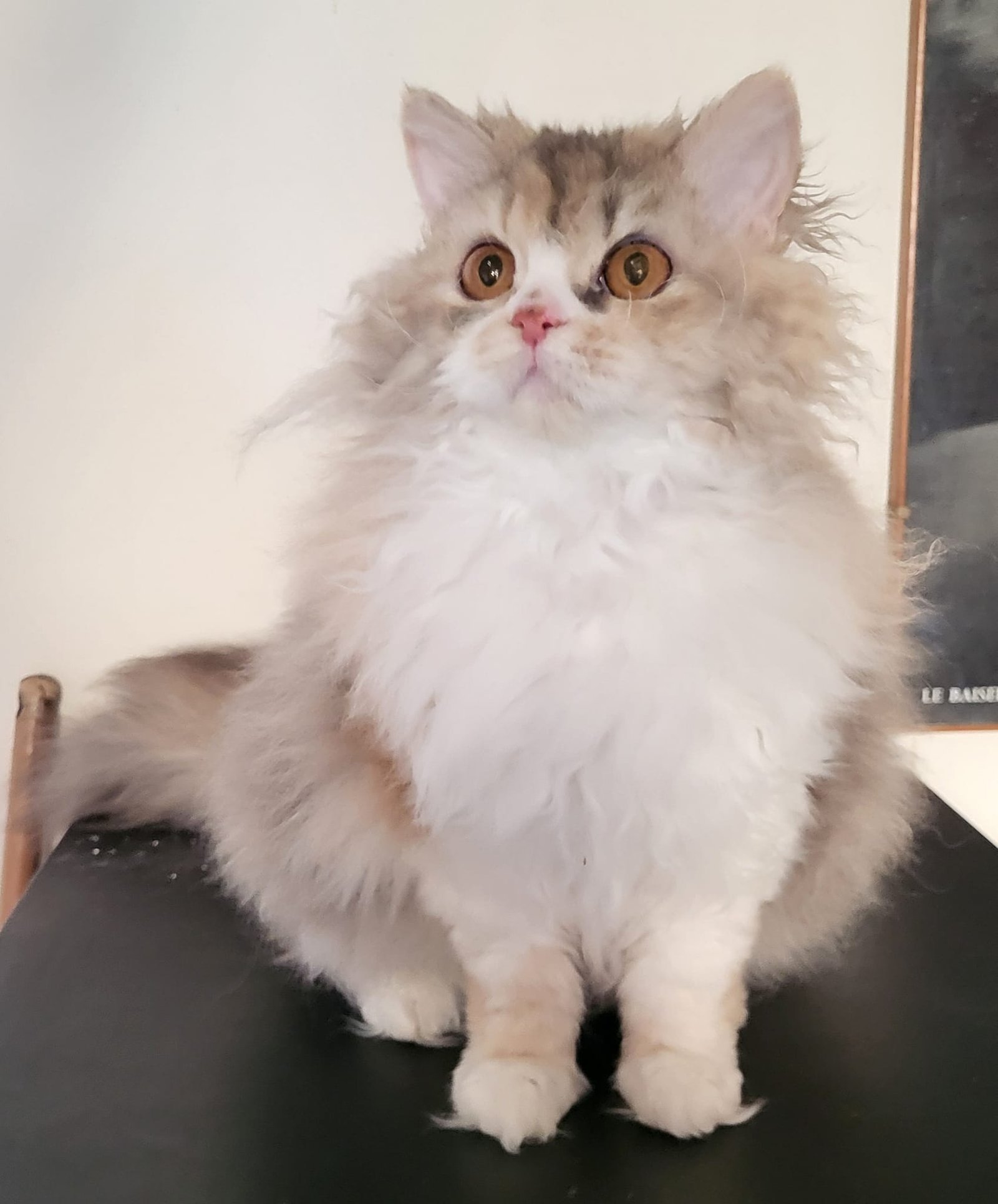 Selkirk Rex blue tortie tabby bicolor. E' una bella giovane femmina con due grandi occhi di color rame intenso e un carattere dolcissimo, tutta fusa e coccole. Ha anche un bel pelo lungo e frisé, una folta gorgera e un'espressione sempre un po' stupita. Anche lei è una splendida mamma per i suoi cuccioli che alleva con cura e amore. Viene dalla Slovenia ed è frutto della proficua collaborazione e grande amicizia con i suoi allevatori Saso e Nina.